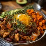 I discovered this bowl on a hectic weeknight when I wanted something fast, nourishing, and full of flavor. I pulled together pantry spices, a couple of sweet potatoes, and chicken, and the result felt like a hug on a plate. The roasted sweetness of the potatoes, the savory, slightly charred chicken, and the bright lift from lime and herbs made it an instant repeat in our meal rotation. If you like comforting bowls that balance sweet, smoky, and tangy notes, this one will quickly become a favorite. For another simple chicken-and-rice idea, check out this BBQ chicken and rice recipe that inspired my love for bowl meals.