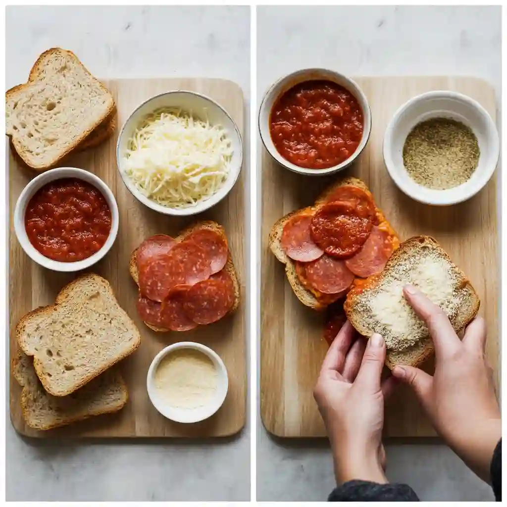 On the plain side of one slice, spread a few tablespoons of marinara sauce. Top with a generous layer of mozzarella and arrange pepperoni slices evenly. Place another slice of bread on top with the buttered side facing out. - Add the crispy pepperoni crust